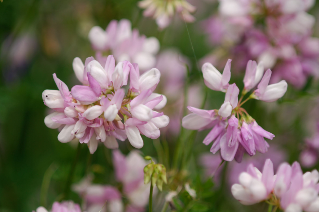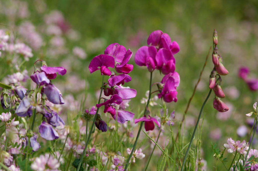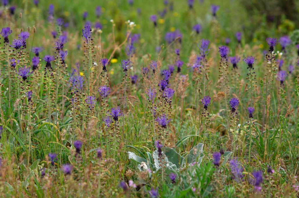 Pour mettre en valeur cette palette, on pourra jouer sur les contrastes de couleurs (Muscari/Coucou) ou de formes (Azurite / Panicaut ou Campanule/Mélique). Il est également possible de jouer sur l’entremêlement des fleurs de la Coronille bigarée et de la Gesse à larges feuilles. Sur les hautes strates, les précoces Ancolie et Valériane peuvent laisser place aux plus tardives Tanaisie et Herbe-aux-Cerfs… Bref, les tonalités violines, jaune, orangées, blanches et rosées donnent l’occasion à d’heureux mariages.