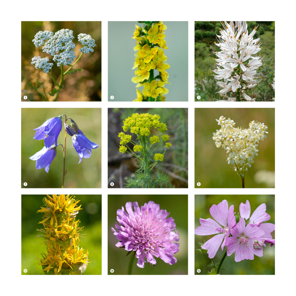 Cette palette se concentre autour d’espèces des sols relativement pauvres en nutriments mais appréciant des conditions fraîches, telles qu’on peut les rencontrer dans les prairies et lisières de moyenne montagne. On y retrouve l’Aigremoine eupatoire, la Campanules à feuilles lancéolées et la Campanule agglomérée, la Spirée commune, la Gentiane jaune, le Genêt sagitté ou encore le Genêt des teinturiers mais auxquelles ont peut également joindre quelques espèces des milieux pelousaires lorsque le sol est amené à s’assécher en été (voir nos nuanciers Costes, Caroux…).