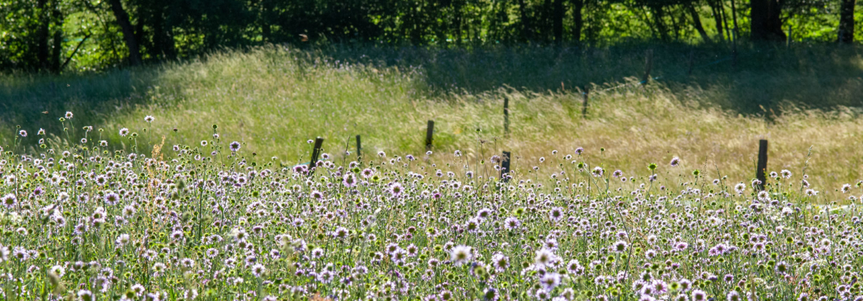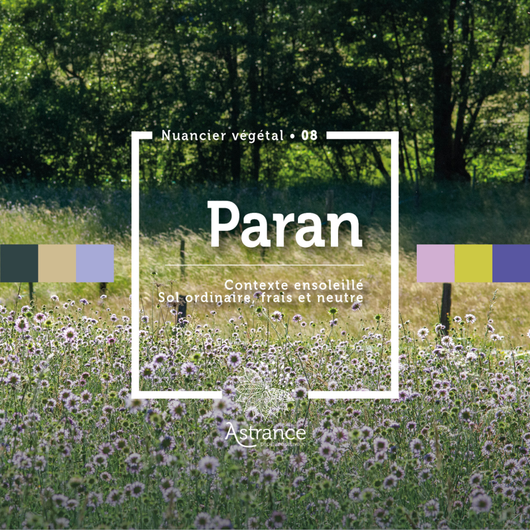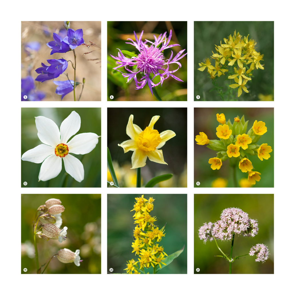 Cette palette rassemble des plantes des sols ordinaires, plus ou moins riches en nutriments. Si les marguerites et les knauties figurent parmi les plantes prairiales les plus fréquentes, d’autres plus discrètes méritent tout autant notre intérêt tant des points de vue paysager qu’écologique. Ces espaces aux sols plus profonds accueillent au printemps, des Primevères, Narcisses des poètes et Jonquilles rapidement relayées par la Campanule étalée, la Sanguisorbe, la Valériane et la Saponaire officinales, la Centaurée jacée et le Milleperthuis perforé. Toutes figurent parmi ces nombreuses espèces susceptibles de nourrir un grand nombre de pollinisateurs.